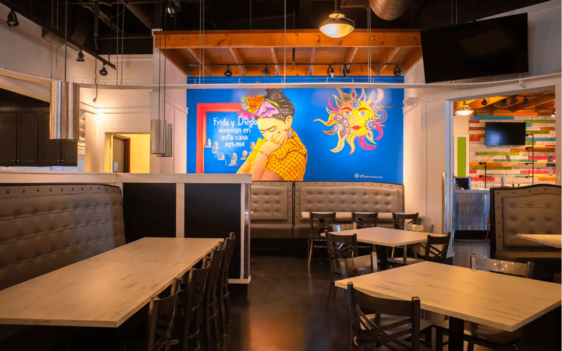 Modern bar and dining space with festive decor—welcoming atmosphere at all Pure Mex Tacos & Tequila locations.